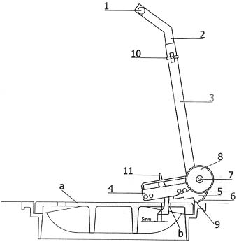 - Stojąc na włazie studzienki (a) trzymając jedną ręką za uchwyt (1) a drugą w okolicy zabezpieczenia (10) urządzenie trzymać pod skosem. Teraz hak (11) wisi pionowo w płozach (4) prowadzenia haka.