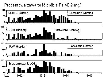 Należy nadmienić, że kluczową rolę odgrywa tu kontrola chemiczna jakości wody w zakresie parametrów ustalonych przez dostawcę technologii firmę CFB BUDENHEIM. Właściwie prowadzony proces dozowania fosforanowych środków ochrony sieci wodociągowej umożliwia znaczącą poprawę jakość wody w sieci w krótkim okresie czasu. Zobrazowane to zostało na Rys. 5