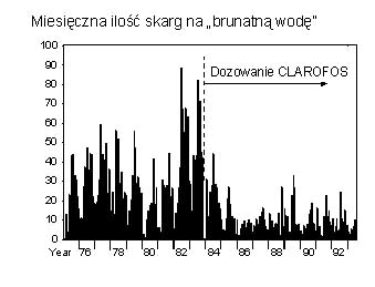 Rys. 3 Wpływ inhibitora fosforanowego (CLAROFOS 125) na jakość wody oraz ilość reklamacji klientów