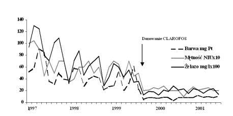 Rys. 5 Zmiana właściwości wody w sieci wodociągowej (Clarofos 124, 4 mg/l)
